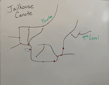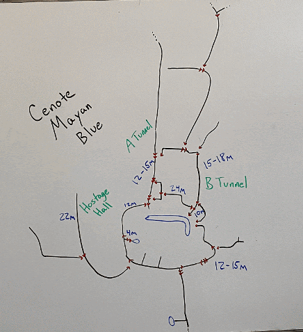 For this next dive, T right at the bottom of the slope. This passage will start off dark then take you in and out of the salt water many times. The next T will be inside the halocline, and you should go T Left. After this T the arrows will face “away” from you. The first arrow you will come across will be one of the “old style” arrows that is much larger than today’s standard. Along this dive you will go in and out of the salt water many times and the size of passage will change several times. If you make it past the next arrow you are now getting close to the border between what is considered Jailhouse and Mayan Blue. For the more adventurous and certified traverses are possible, they just require many more tanks.